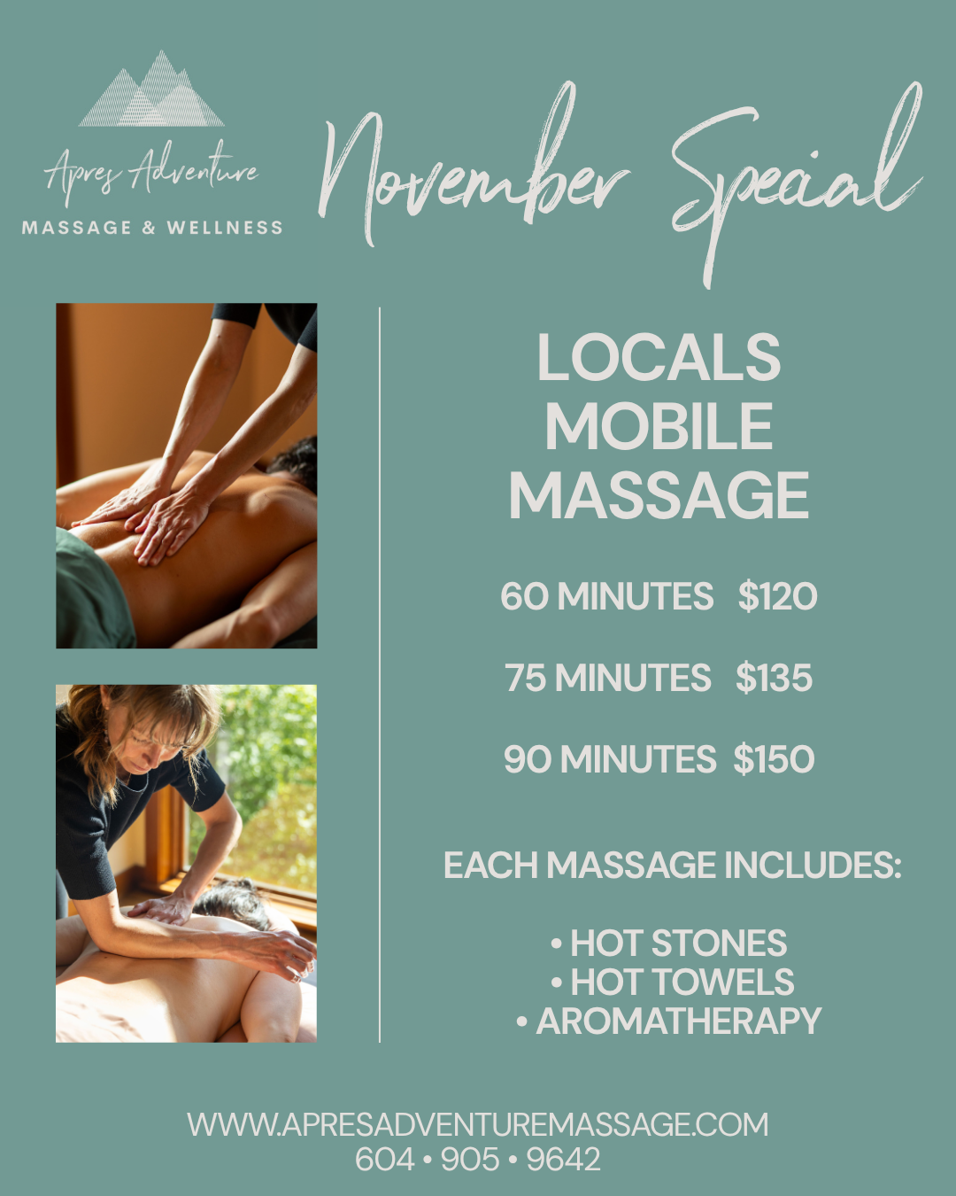 Apres Adventure Massage & Wellness is located in Revelstoke, BC, nestled in the majestic Columbia River Valley. Recharge, restore and relax in the comfort of your home or vacation accommodation and let us help you create your own private wellness escape without having to step foot out your door!